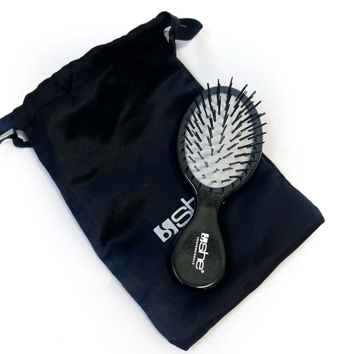 • Cepillo de bolsillo negro: Compacto y práctico, este cepillo es perfecto para llevar en tu bolso o equipaje, permitiéndote desenredar y cuidar tu cabello en cualquier momento y lugar. Viene con una bolsa para poder guardarlo en el bolso.