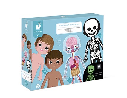 Puzzle gigante de Janod para trabajar el cuerpo humano. Incluye 1 puzzle por ambas caras de 50 piezas niño/niña, 1 puzzle de 75 piezas sobre los órganos y 1 puzzle de 100 piezas fosforescentes sobre el esqueleto. Los puzzles tienen 1 metro de altura para ayudar a los niños a comprender mejor su cuerpo. El puzle incluye tarjetas educativas detalladas para conocer las distintas partes del cuerpo humano. Disponible en 12 idiomas